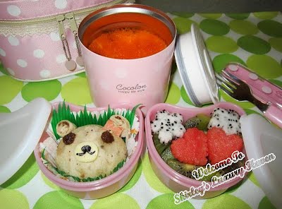 Chawanmushi was my first thought when I read about the themos that could keep my food warm for 6 hrs. Perfect! I decided to fill one box with Fresh Fruits & make a Teddy Bear Sandwhich to fit into the other.